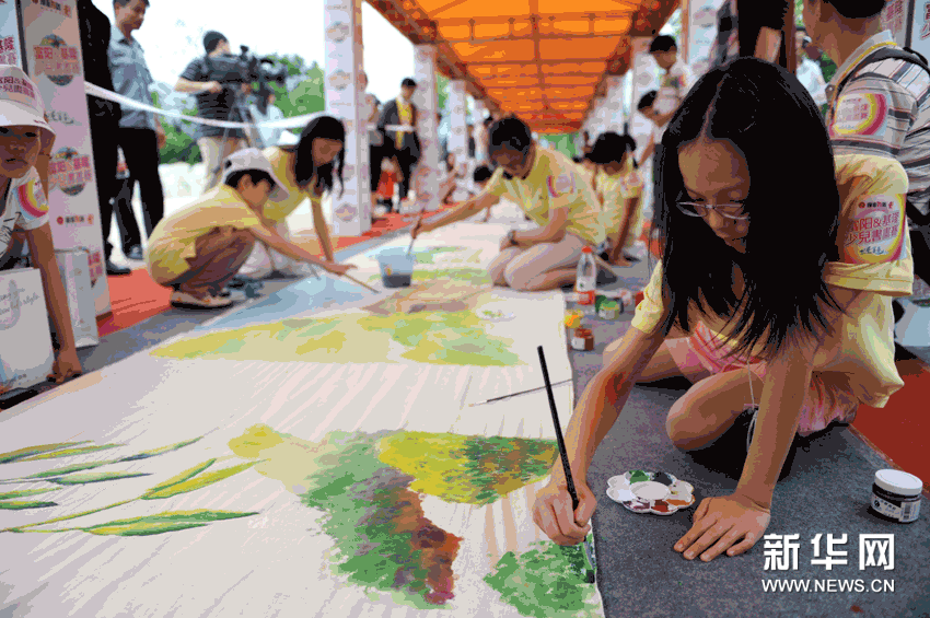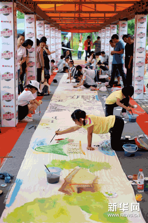 (1)6月1日,來自臺灣基隆市和浙江省富陽市的小朋友正在一起繪制書畫長卷。