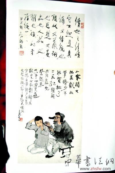 本次展覽最大亮點當屬已故著名畫家李可染的一幅特殊畫作——《白毛女》。它表現(xiàn)的是歌劇《白毛女》中楊白勞除夕夜為喜兒扎紅頭繩的生動場景,畫中人物栩栩如生,非常傳神。作者在畫上方用毛筆題寫了戲中那段膾炙人口的經(jīng)典唱詞“人家閨女有花戴”,落款標明此畫創(chuàng)作于“三十八年四月某夜,觀白毛女歌劇歸來”所畫。卷軸上方,為原中國畫研究院院長劉勃舒的鑒賞墨寶——“傳世之杰作,它必然是具備又傳統(tǒng)也現(xiàn)代,又藝術也思想,又畫品也人品,又雅也俗的矛盾統(tǒng)一”。據(jù)“讀畫樓”創(chuàng)辦人梅子先生透露,此幅作品正是友人劉勃舒先生轉讓。