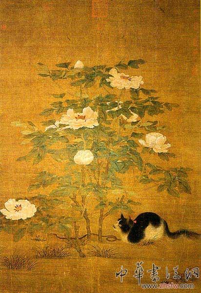 《富貴花貍》雖無年款,但畫中除主題牡丹與貍外,不多描繪周遭環(huán)境,僅以草木根部暗示地平面的存在,細部描繪工致,與徽宗〈蠟梅山禽〉諸作相似,可能也是徽宗時期的畫院作品。